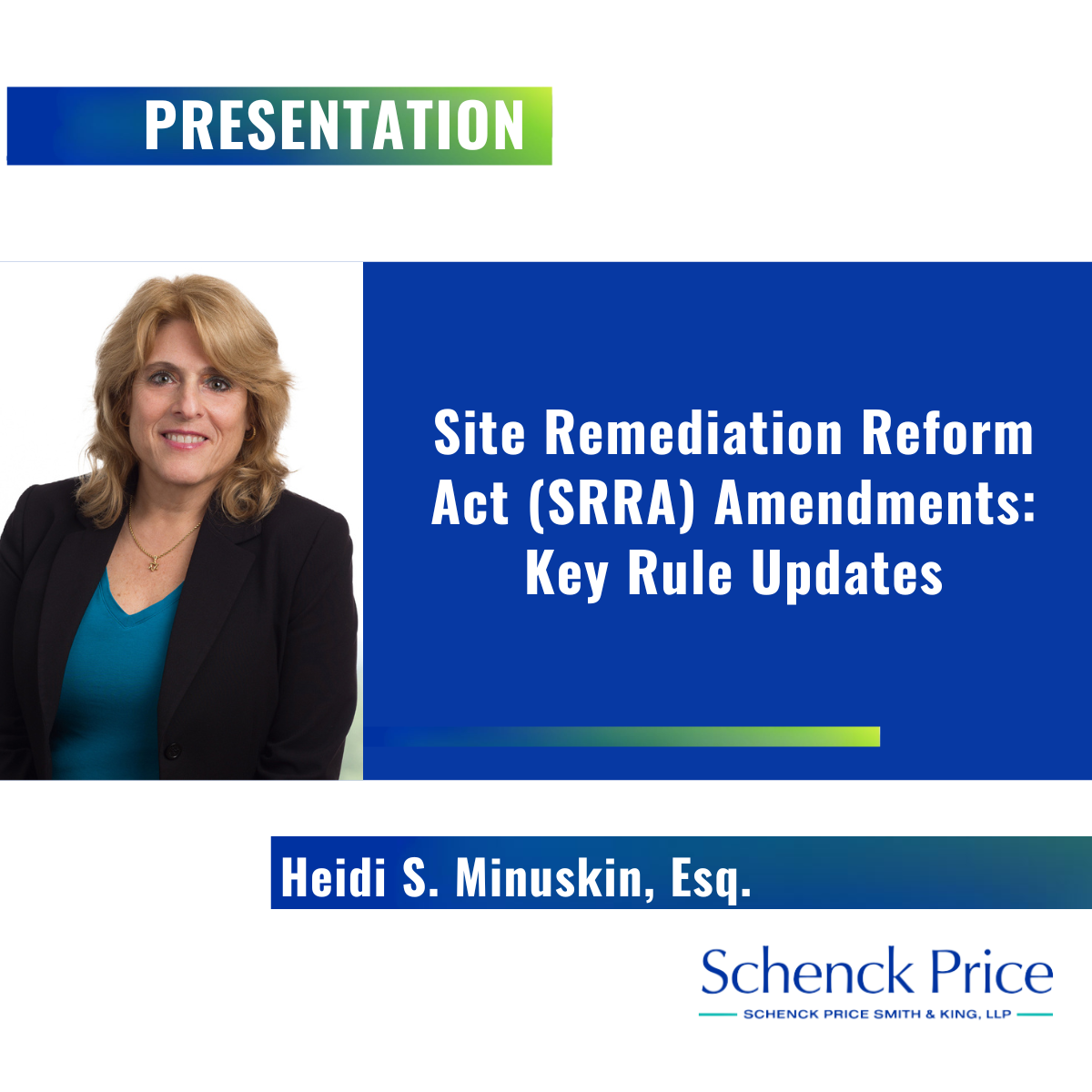 On January 15, 2026, from 9:00-11:00 a.m., Heidi Minuskin was one of three instructors in the virtual course, “Site Remediation Reform Act (SRRA) Amendments: Key Rule Updates.” This course will provide an overview of the major changes introduced through the NJDEP’s SRRA Amendments’ recent rule adoption.