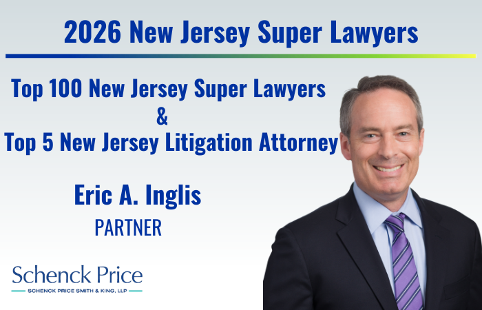 Schenck Price congratulates the Co-Chairman of its Litigation Department, Eric Inglis, on being named for the tenth year running as one of New Jersey’s Top 100 Super Lawyers. This year, Mr. Inglis was also named as one of the Top 5 Business Litigation attorneys in New Jersey.