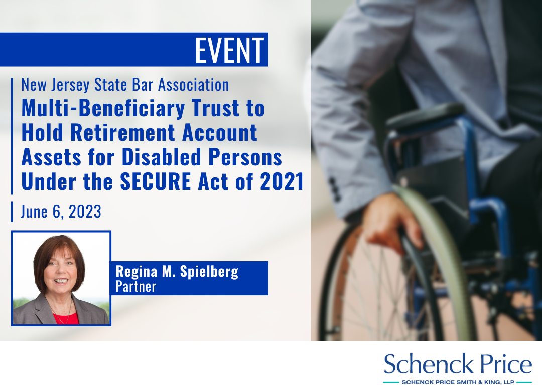 Schenck Price Partner and Co-Chair of the Elder and Special Needs Law Practice Group, Regina M. Spielberg, presented at NJICLE’s 89th Semi-Annual Tax and Estate Planning Forum on June 6, 2023. Regina presented “Multi-Beneficiary Trust to Hold Retirement Account Assets for Disabled Persons Under the SECURE Act of 2021.” Regina joined a panel of attorneys to discuss various topics and recent developments in Tax and Estate Planning.