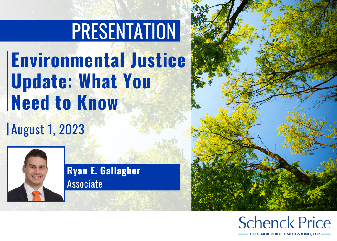 Associate Ryan Gallagher spoke at CIANJ’S NJDEP Regulatory Update on August 1. Ryan presented “Environmental Justice Update – What You Need to Know” and discussed the fundamentals of Environmental Justice, how it is being implemented, and what steps must be taken when seeking permits/renewals for businesses.